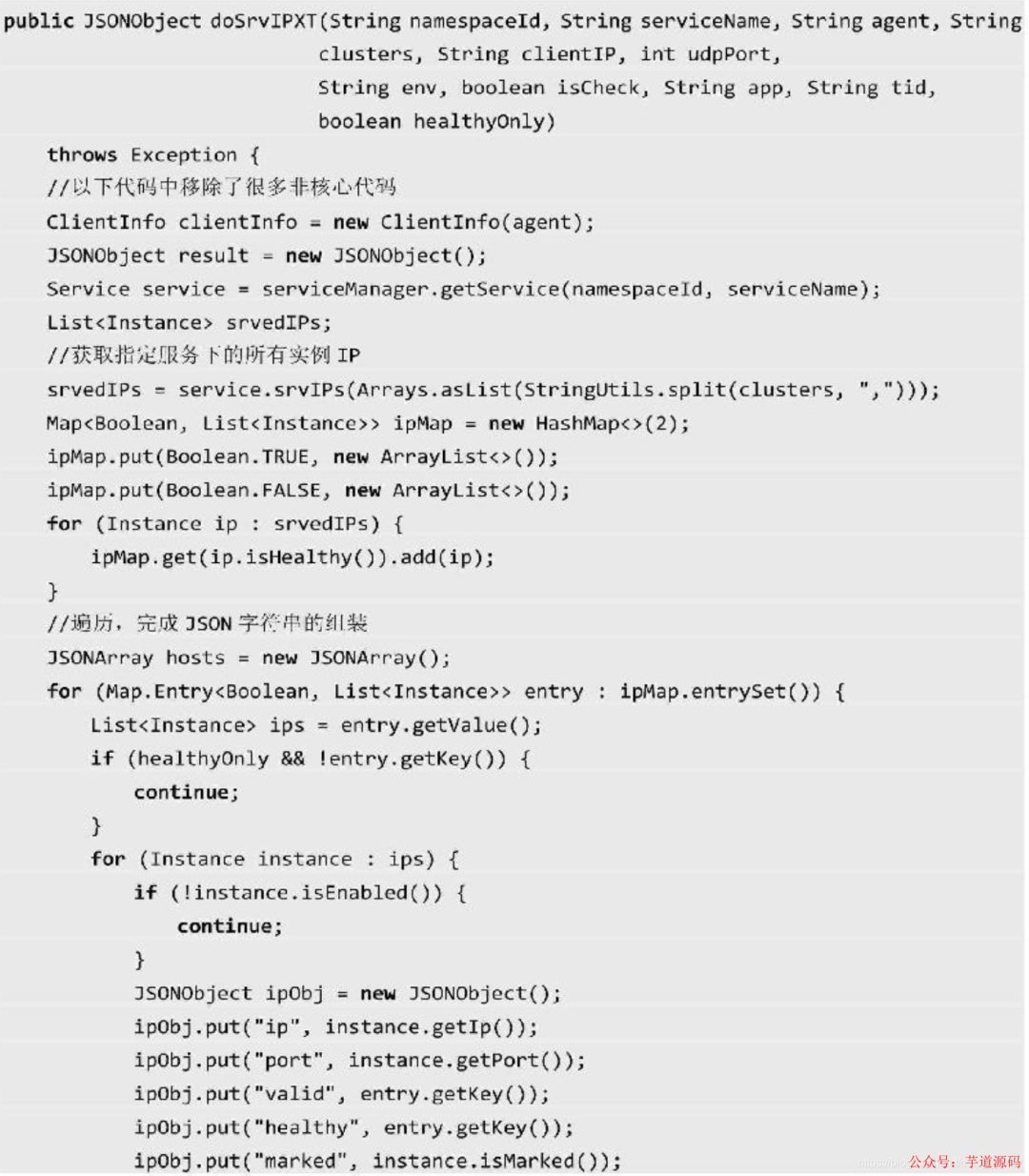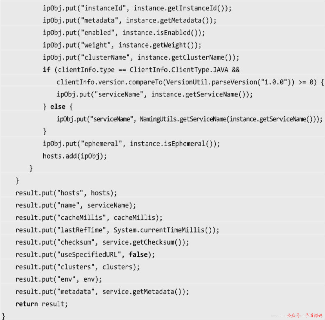 服务消费者收到请求之后,使用HostReactor中提供的processServiceJSON解析消息,并更新本地服务地址列表