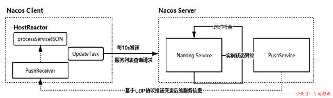 Nacos客户端中有一个HostReactor类,它的功能是实现服务的动态更新,基本原理是: