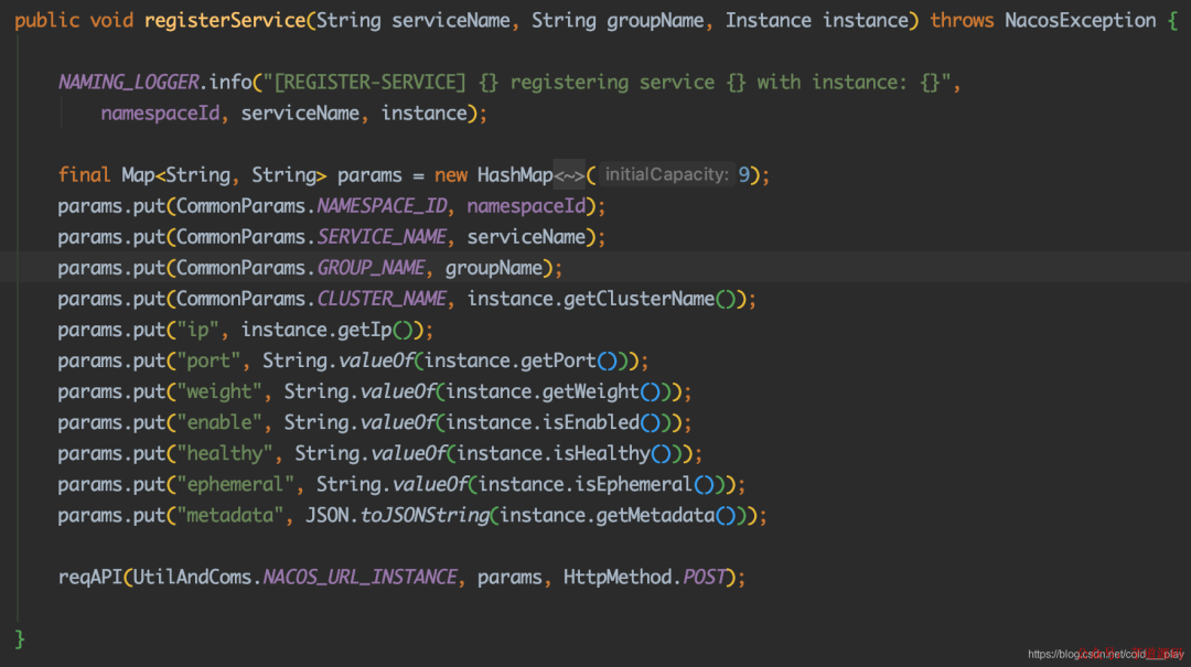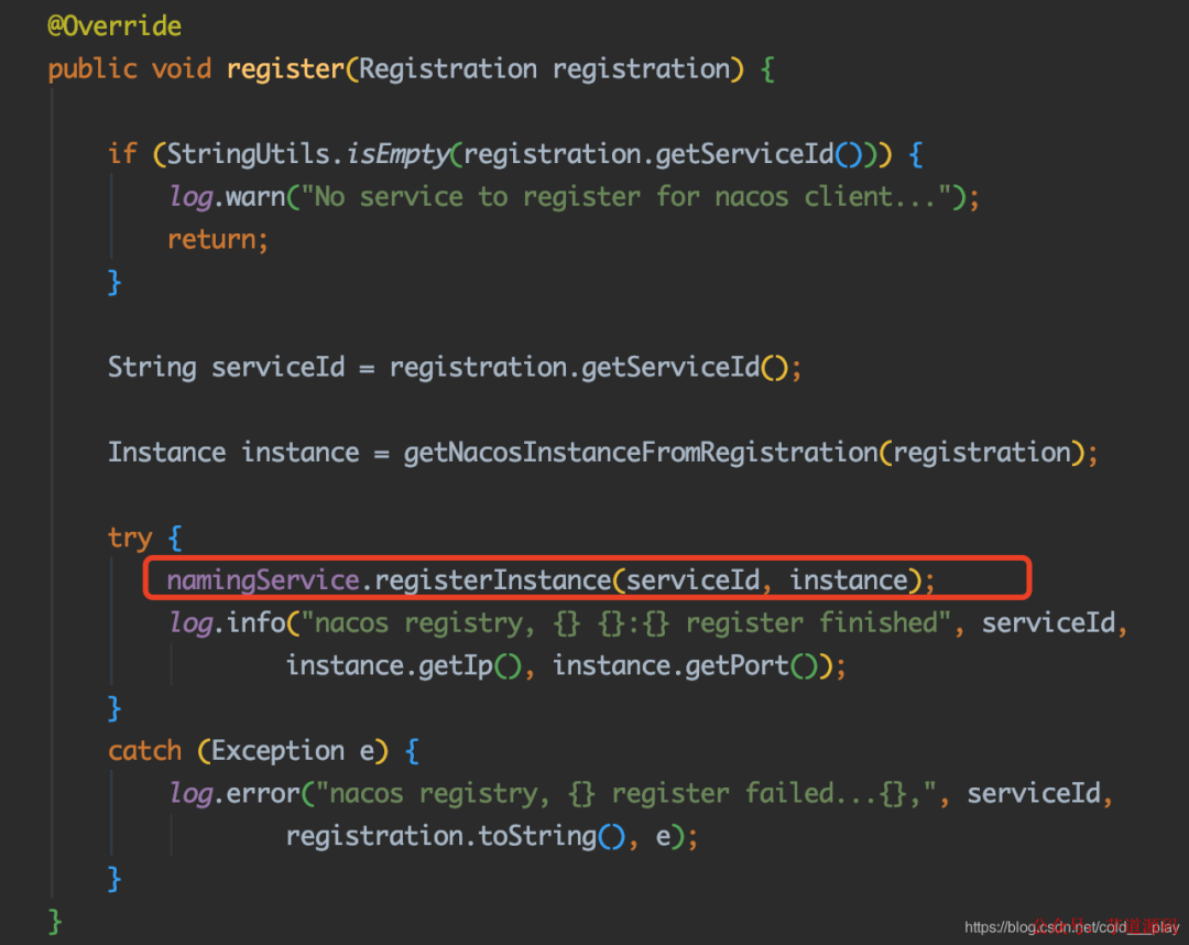 最终会调用NacosServiceREgistry.register()方法进行服务注册。