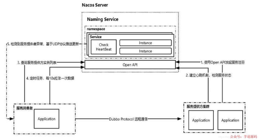 对于服务端,它和服务提供者的实例之间维持了心跳检测,一旦服务提供者出现异常,则会发送一个Push消息给Nacos客户端,也就是服务端消费者