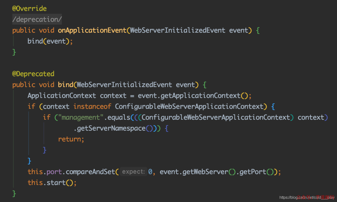 AbstractAutoServiceRegistration实现了onApplicationEvent抽象方法,并且监听WebServerInitializedEvent事件(当Webserver初始化完成之后) , 调用this.bind ( event )方法。