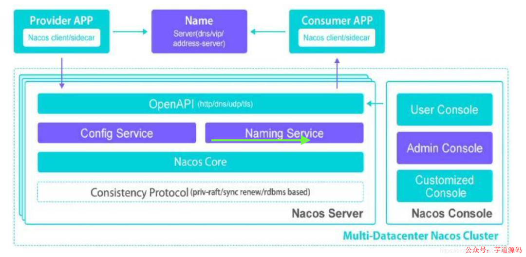 Nacos Server:Nacos服务提供者,里面包含的Open API是功能访问入口,Conig Service、Naming Service 是Nacos提供的配置服务、命名服务模块。Consitency Protocol是一致性协议,用来实现Nacos集群节点的数据同步,这里使用的是Raft算法(Etcd、Redis哨兵选举)