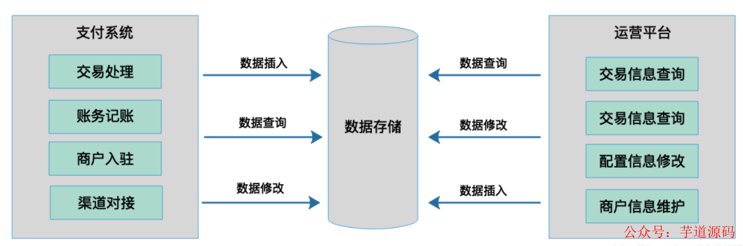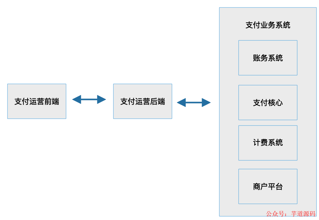 运营平台的数据来源是支付各个业务系统,考虑到安全、合规等问题运营平台不能直接操作业务系统的数据库,需要通过接口来获取和操作数据。为了扩展性更好一些,一般系统都会做到前后端分离。支付运营平台的交互模式如下所示