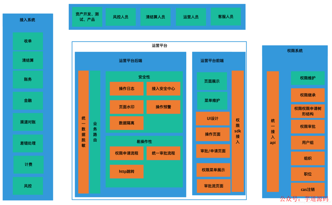 运营平台无法绕开权限的管理,权限管理是运营平台非常核心的一个模块,一般情况下会专门设计一个权限系统,提供SDK让包括运营平台在内的内部服务系统接入使用。建议使用RBAC模型来设计权限系统。