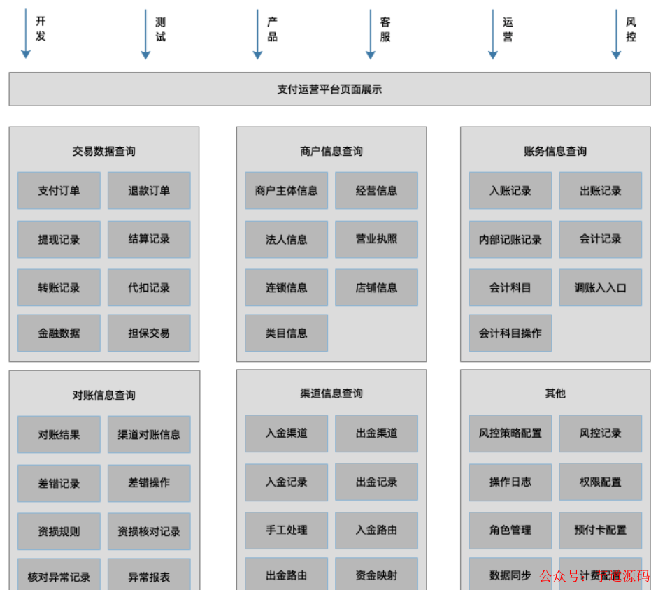 支付运营平台是提供给支付公司内部员工使用的,用来查交易信息,商户信息,费率信息等的内部服务工具。使用的群体有支付开发人员、测试人员、支付产品人员、清结算人员、财务人员、客服人员等。开发、测试以及产品人员需要使用平台处理值班问题,及时查询数据,监控服务。清结算人员使用平台处理对账以及调账等问题。客服人员使用平台查询交易信息、商户信息以第一时间反馈给咨询的客户。虽然运营平台不在支付体系的主链路上,但是作用绝对不容小觑,任何一家支付公司都离不开支付运营服务。