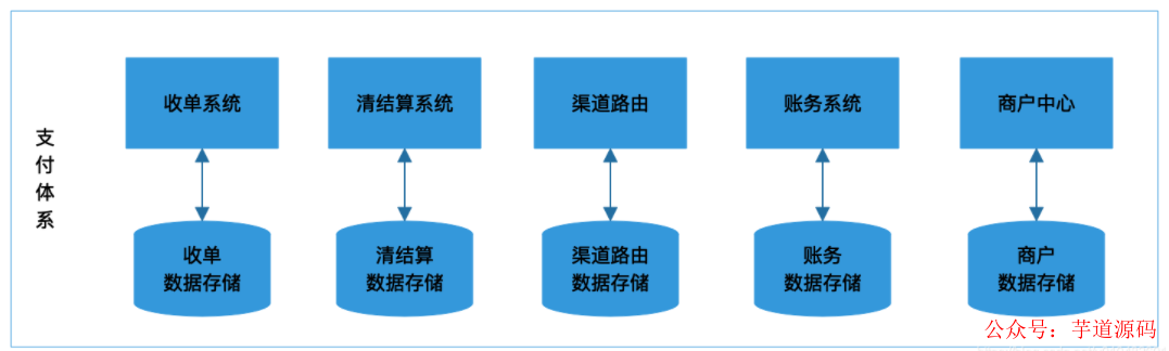 但是随着支付公司业务量的增长,一个支付系统处理所有事情的局限性慢慢凸显出来。首先是耦合性太强,无法灵活扩展,其次是系统性能遇到了瓶颈。这时候迫使要把支付系统按照业务模块拆分成各个子系统,以提升可扩展性和容错能力,比如负责业务逻辑处理的拆分成收单系统,负责结算的拆分成清结算系统,负责记账的拆分成账务系统,负责商户信息管理的拆分成商户系统。系统拆分完成之后也并不能解决性能的问题,因为性能的瓶颈会凸显在数据库,所以需要把数据库也根据子系统来拆分。拆分之后的支付体系架构如下所示:
