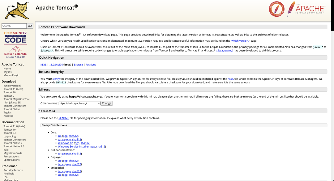 Apache Tomcat是一个开源的Java Servlet容器和Web服务器。它实现了Java Servlet、JavaServer Pages (JSP)、Java Expression Language和Java WebSocket技术的规范。目前 Tomcat 11 beta 版已经发布了。
