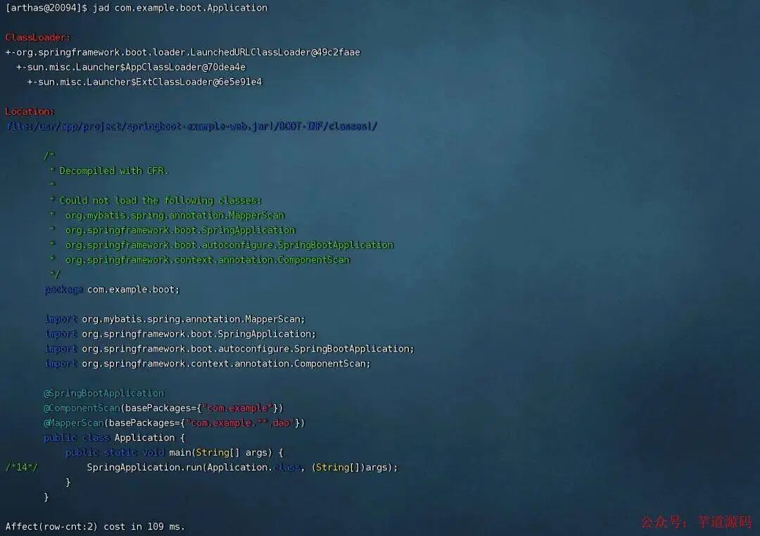 某些时候我们想要查询线上的源码是否正确发布,可以通过 jad 命令来反编译类,以此来查询源码信息,例如反编译Application类,命令如下。