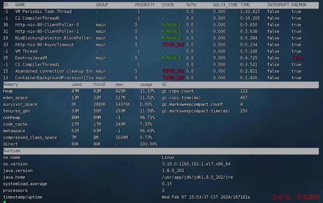 回车之后,一共有三块信息,分别是线程信息、内存信息、运行时信息 ,界面如下。