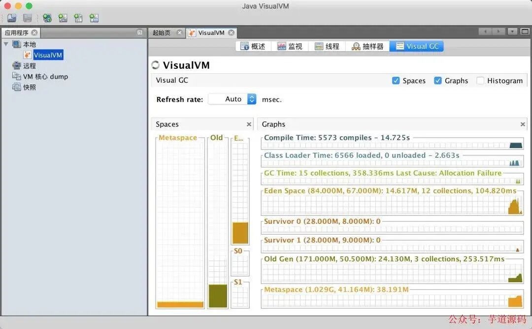 通常,我们会将 Visual GC 插件安装到 VisualVM 中,利用它可以更加直观的观察到整个垃圾回收的过程。界面如下。