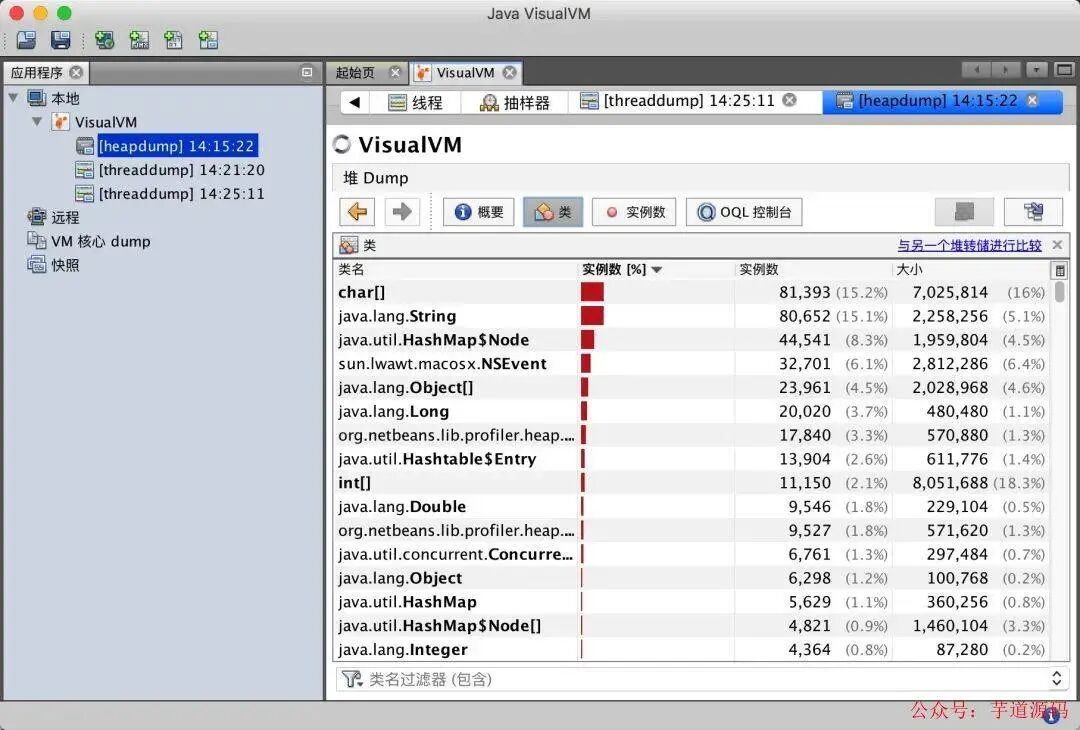 MAT:一款功能强大的 Java 堆内存分析器,可以用于查找内存泄漏以及查看内存消耗情况,用户可以利用 visualvm 或者是 jmap 命令生产堆文件,然后导入工具中进行分析