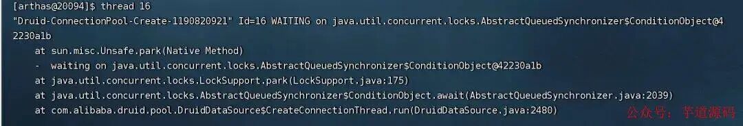 如果我们想要具体查看某一个线程的运行情况,可以使用 thread 命令。例如查询线程 Id 为16的运行状态信息,命令如下。