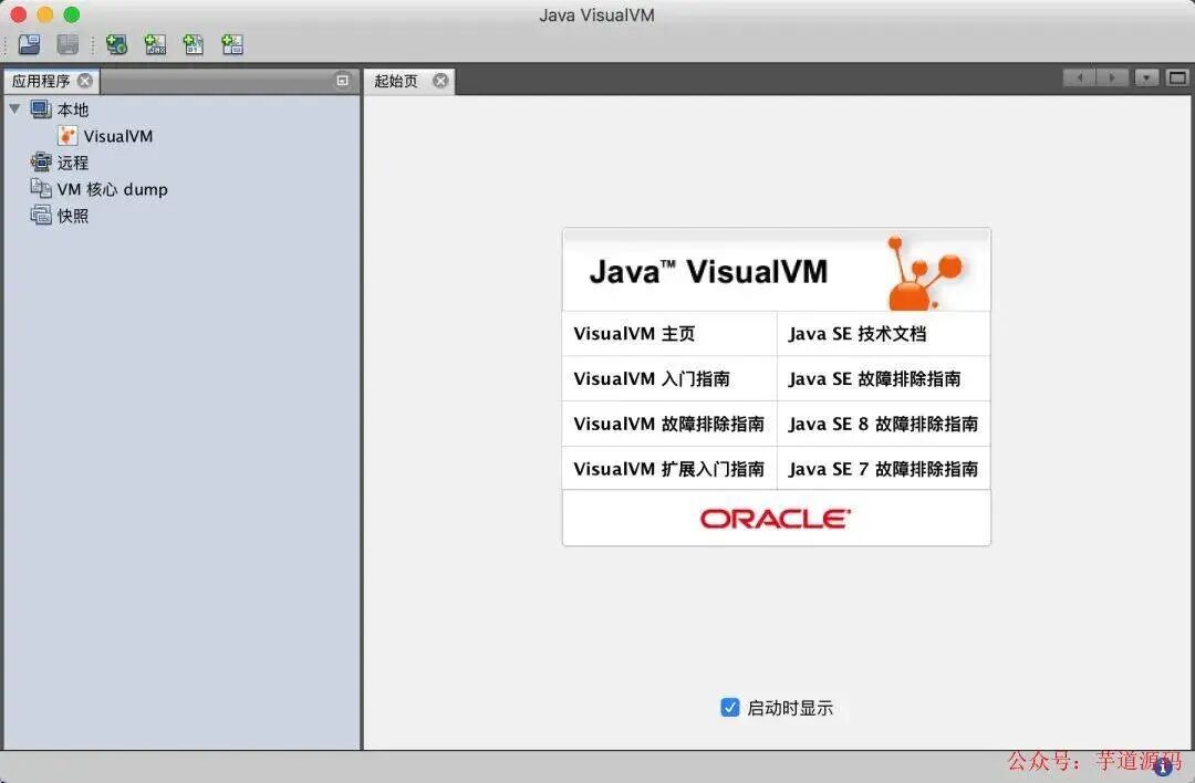 在命令行输入jvisualvm即可启动。如果 Windows 用户,也可以在 jdk 的安装目录的 bin 目录下,找到jvisualvm.exe,双击启动。界面如下。