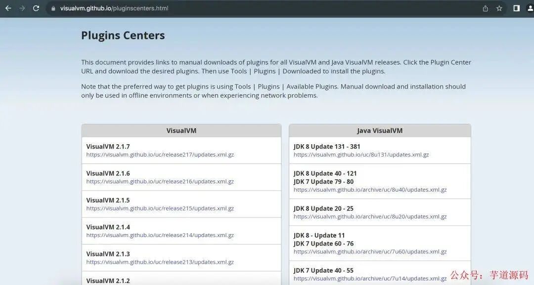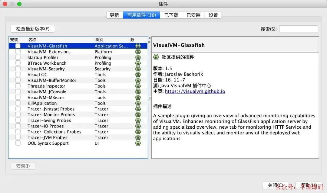 VisualVM 还有一大亮点,就是它支持插件安装。每个插件的关注点都不同,有的是监控 GC,有的是监控内存,有的是监控线程等,可以在插件市场上寻找对应的工具进行安装,以便更好的排查服务性能问题。