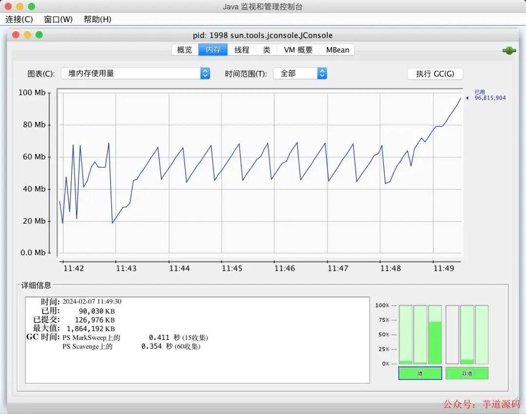 内存板块主要展示了内存的使用情况,同时可以查看堆和非堆内存的变化值对比,也可以点击执行 GC 来触发 GC 的执行。界面如下。