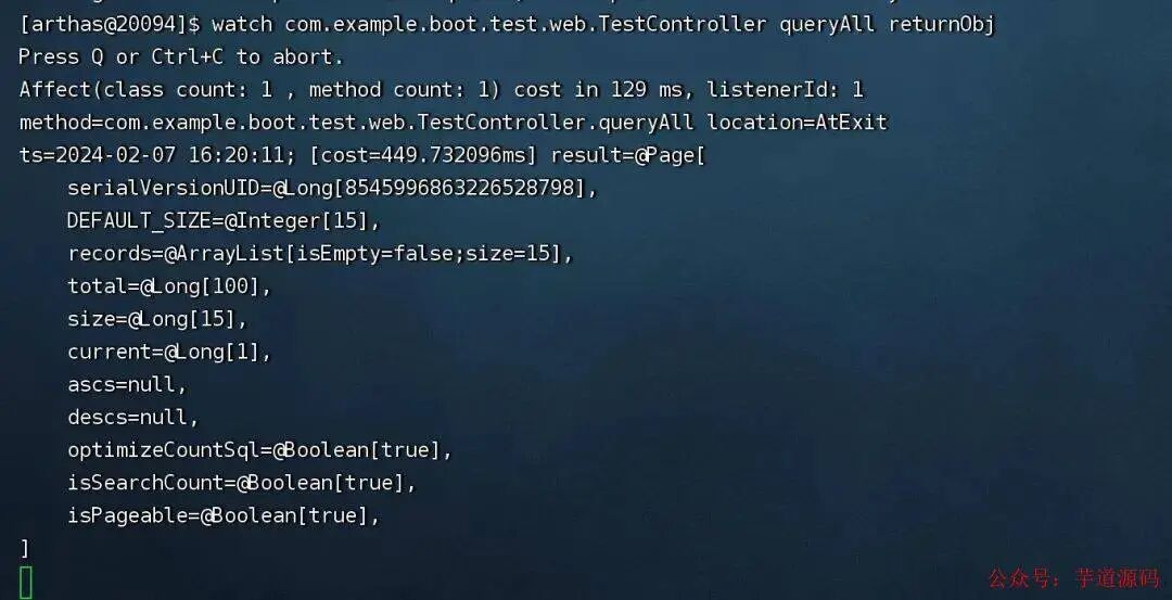 某些场景下我们想要观察某个方法的返回结果,以便判断是否符合预期效果,可以通过 watch 命令来实现,例如观察TestController类的queryAll()方法的返回结果,命令如下。