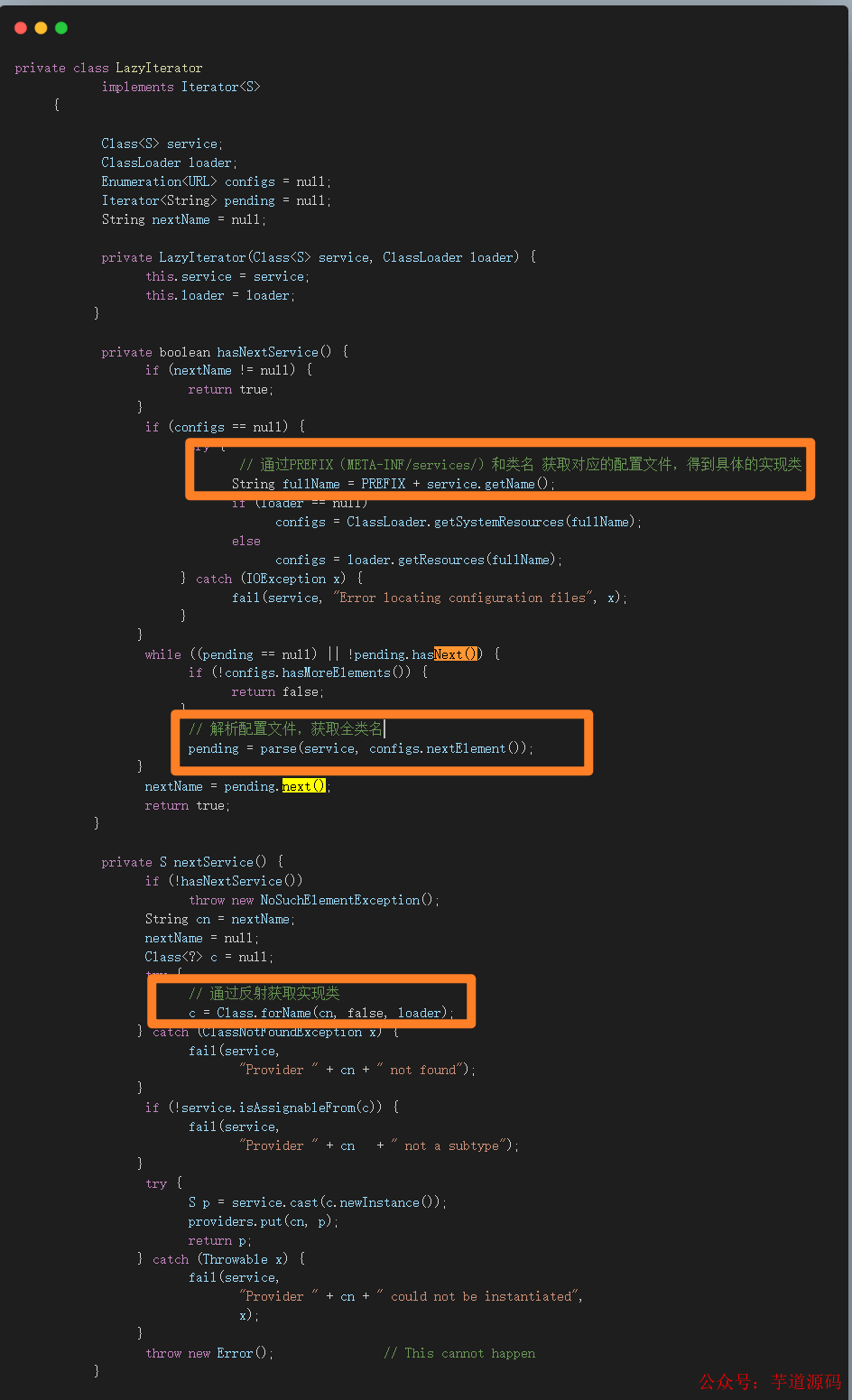 不难理解,SPI 的重点就是 ServiceLoader,看源码,我们发现这个类是一个 final 类型的,所以是不可被继承修改,同时它实现了 Iterable 接口,方便后续我们能够通过迭代的方式得到对应的服务实现。