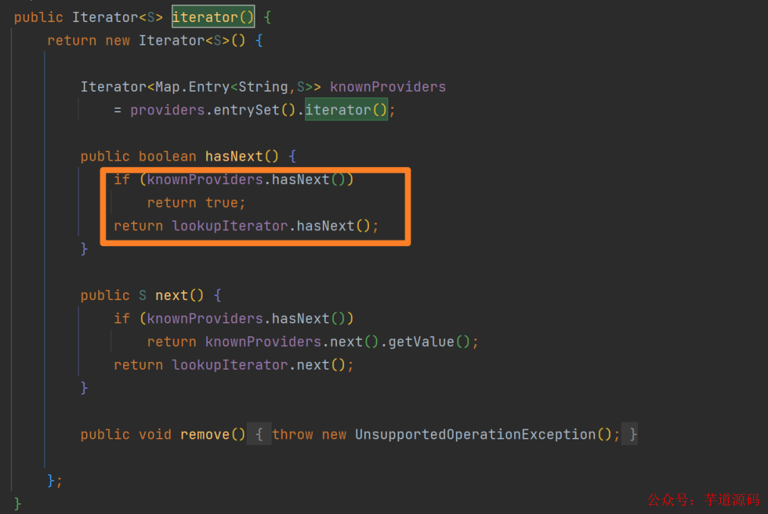 ServiceLoader 实现了 Iterable 接口的方法后,具有了迭代的能力,在 iterator() 方法被调用时,首先会在 ServiceLoader 的 Provider 缓存中进行查找,如果缓存中没有命中那么则在 LazyIterator 中进行查找: