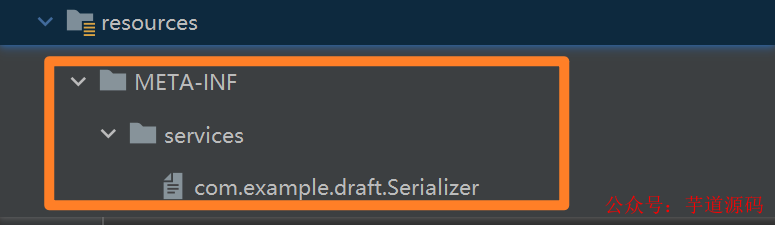 再建立一个以暴露出去的接口的全路径为命名的文件,比如我这里的就是 com.example.draft.Serializer,注意这个文件一定要放在 resources/META-INF/services 下面