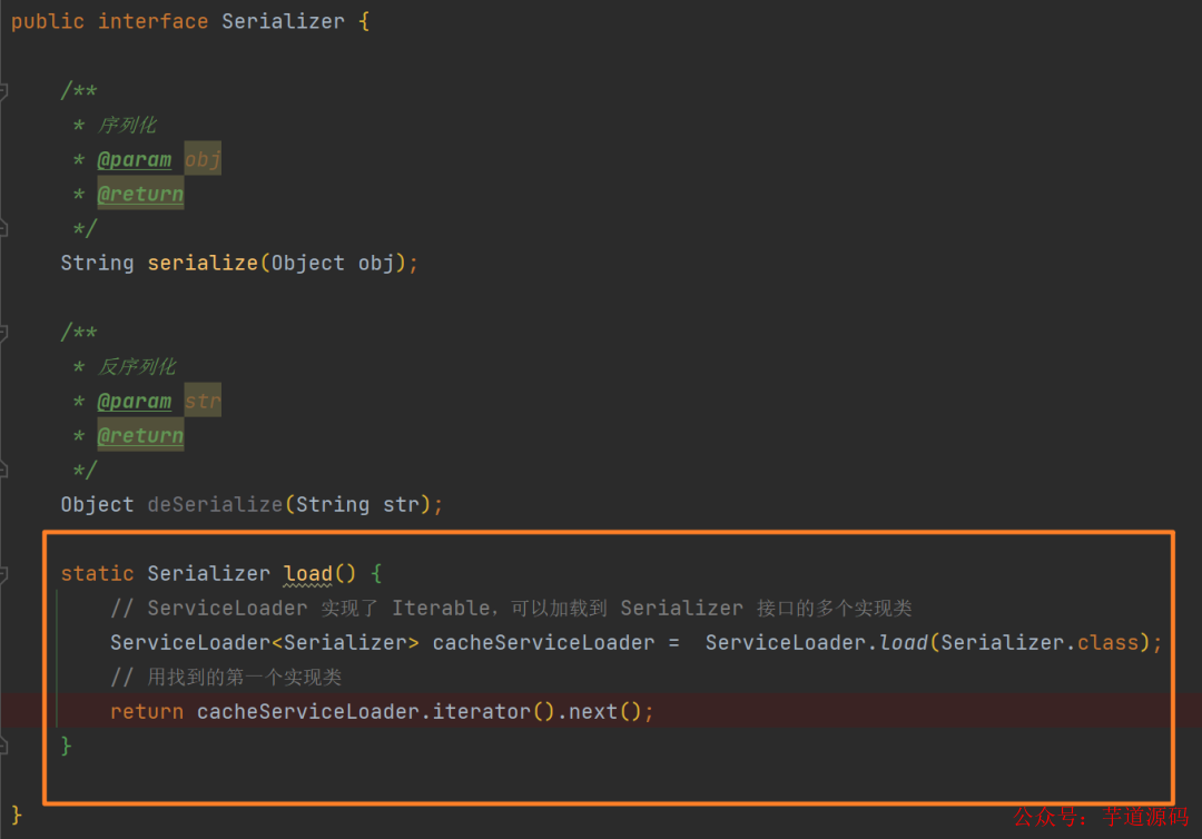 重点在这里的 load 方法,我们通过 ServiceLoader.load() 来加载指定的 Serializer 实现类列表,然后使用第一个实现类。具体底层原理咱们先按下不表。