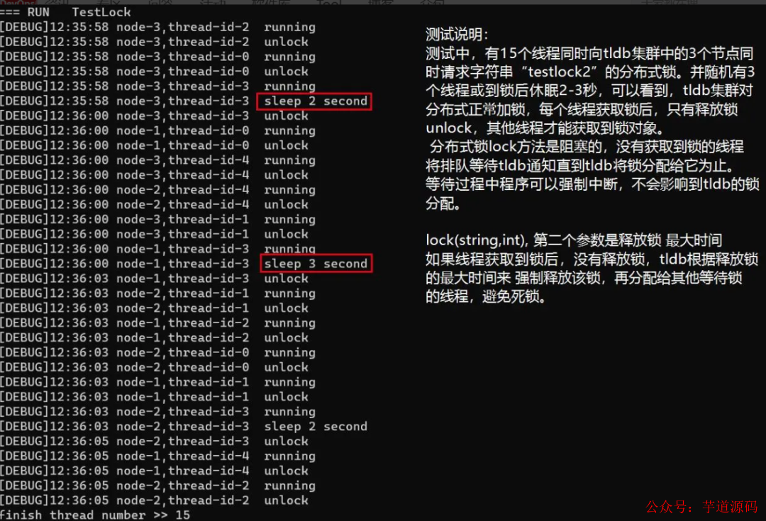以下是 tldb 分布式锁的功能测试数据:多线程并发 调用 lock 获取同一个对象锁后,程序的运行数据:
