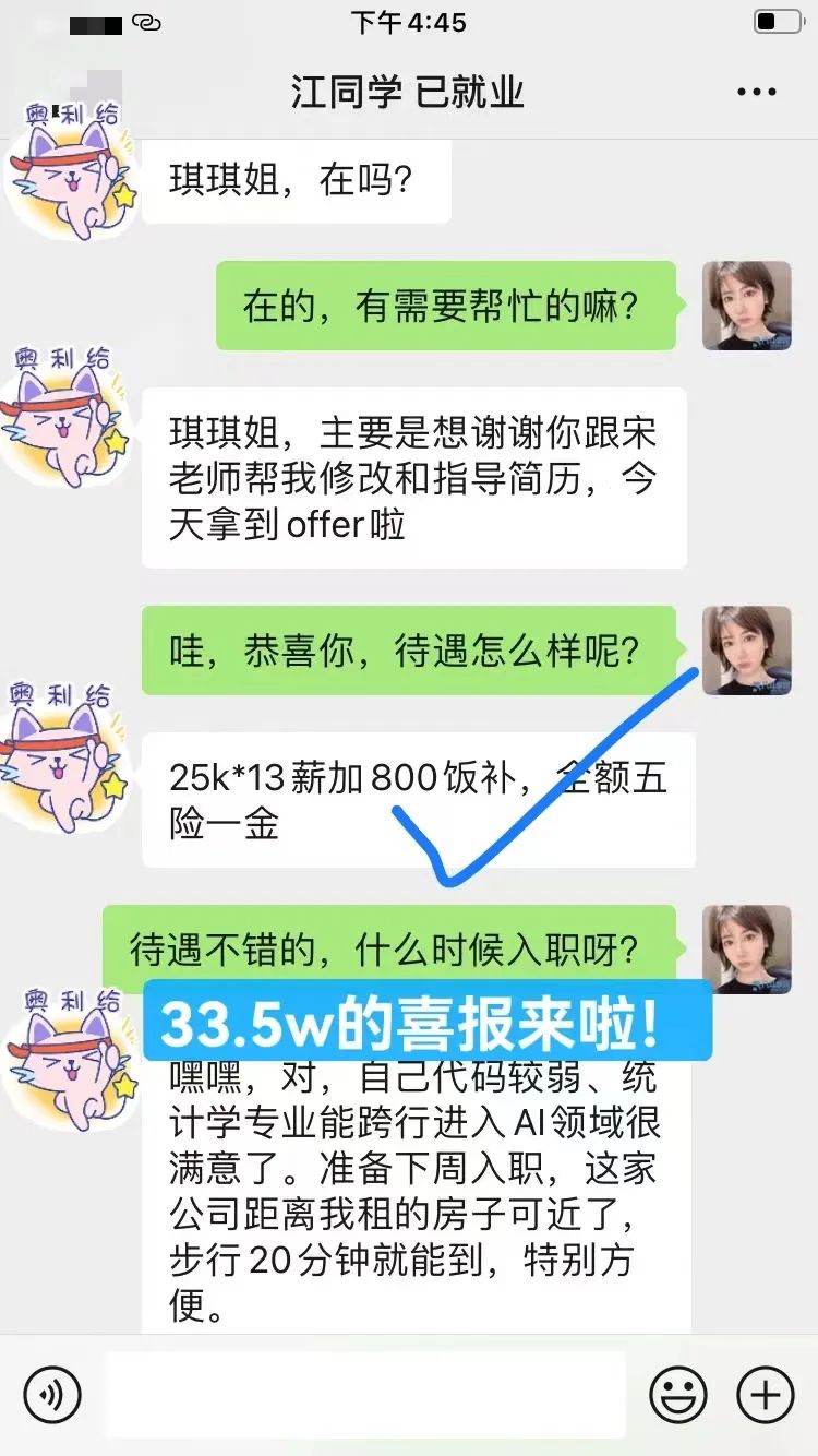 3、统计学专业毕业,看好AI趋势,但是计算机基础和代码能力较弱,考虑跟班系统提升。经同学介绍果断报名八斗跟着宋老师学习,经过4个多月的努力,第一份工作就拿到33.5w的年薪,成功入行!