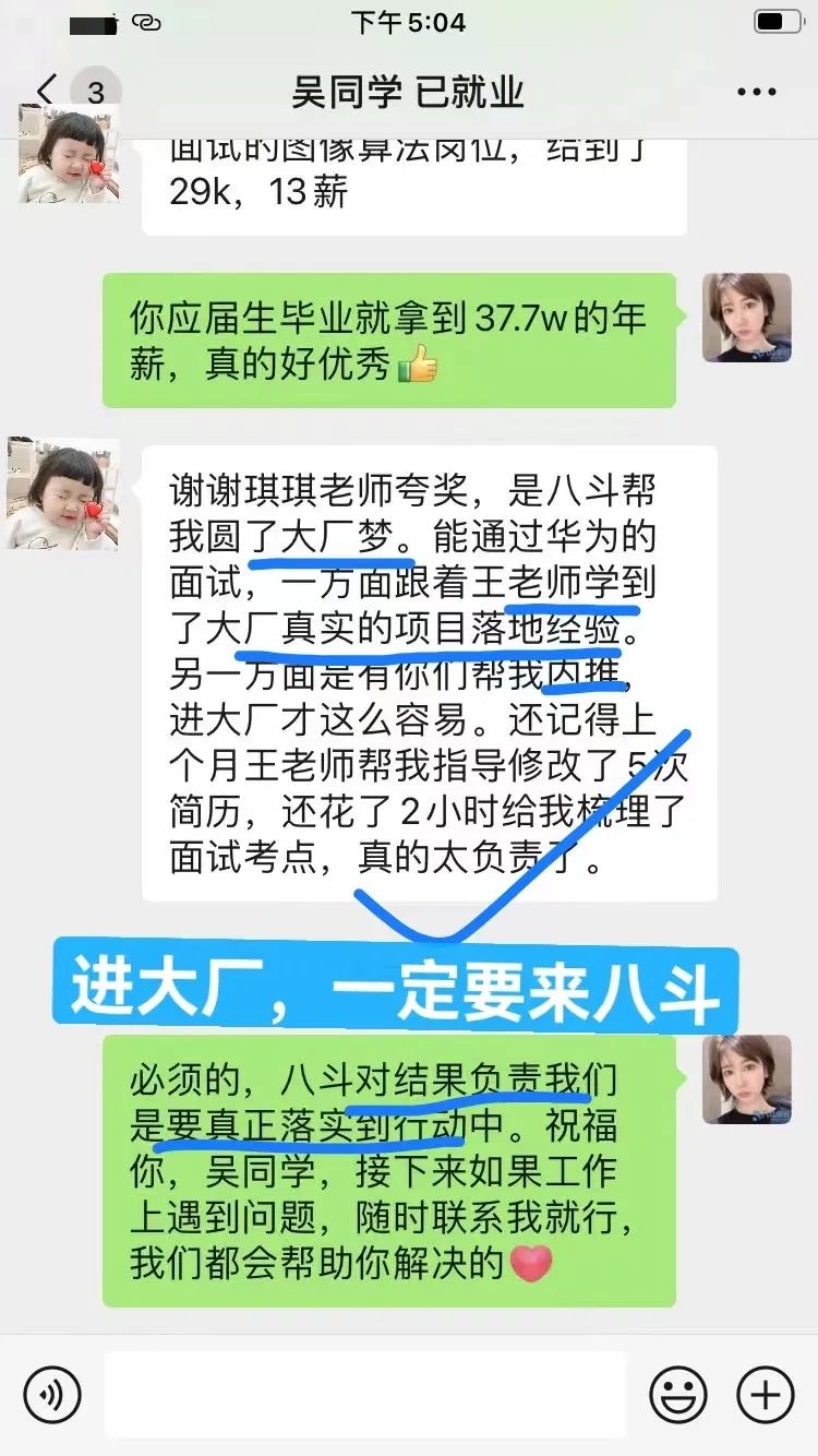 4、应届生吴,通过4个月的学习顺利进入西安华为公司,年薪高达37.7w。八斗对结果负责是落实在行动中的,高质量课程+合作内推,真正能帮大家圆大厂梦。