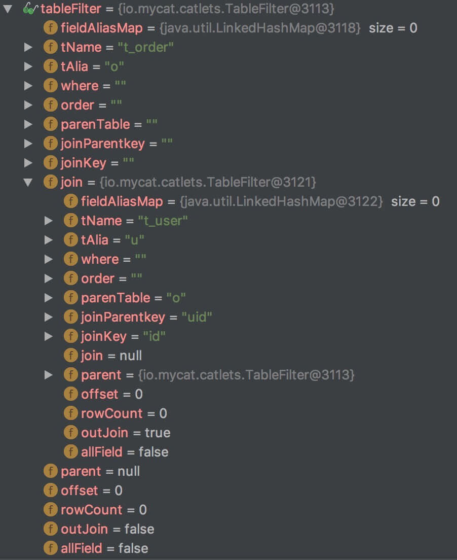 举个例子,/*!mycat:catlet=io.mycat.catlets.ShareJoin */ SELECT o.id, u.username from t_order o join t_user u on o.uid = u.id; 解析后,TableFilter 结果如下: