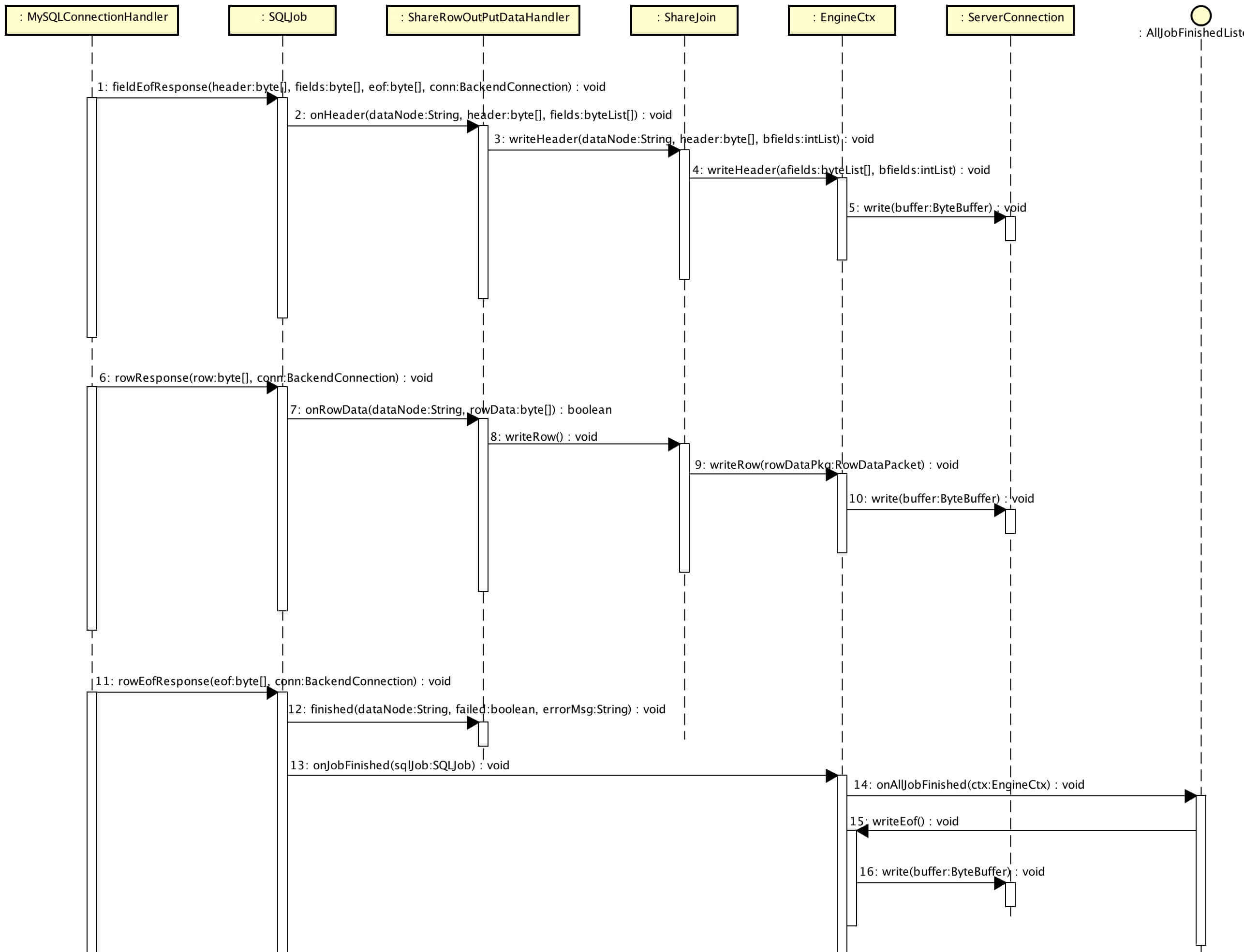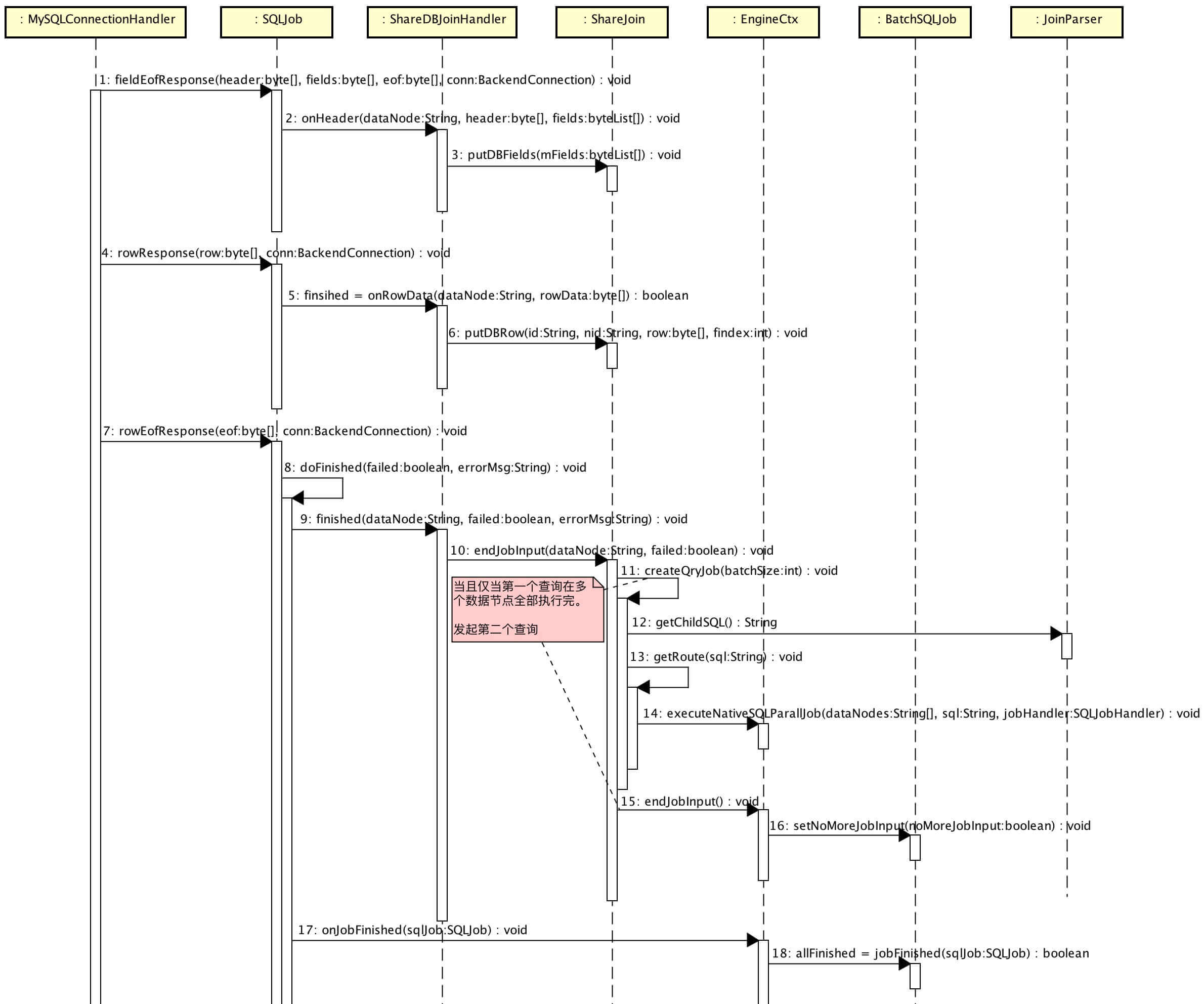 #fieldEofResponse(...):接收数据节点返回的 fields,返回 header 给 MySQL Client。#rowResponse(...):接收数据节点返回的 row,匹配左表的记录,返回合并后返回的 row 给 MySQL Client。#rowEofResponse(...):当所有 row 都返回完后,返回 eof 给 MySQL Client。