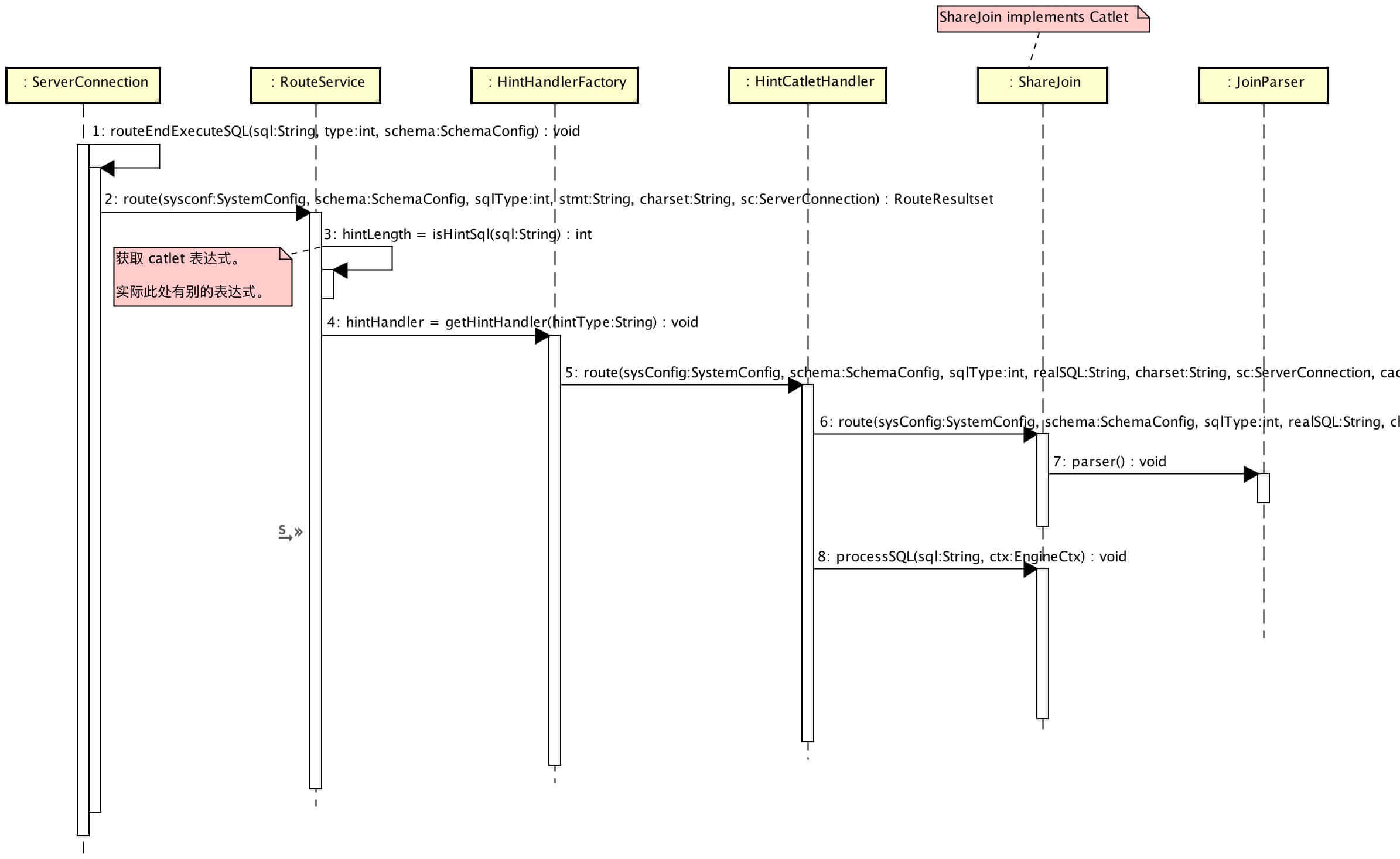 SQL 上,需要添加注解 /*!mycat:catlet=io.mycat.catlets.ShareJoin */ ${SQL} 。RouteService#route(...) 解析注解 mycat:catlet 后,路由给 HintCatletHandler 作进一步处理。