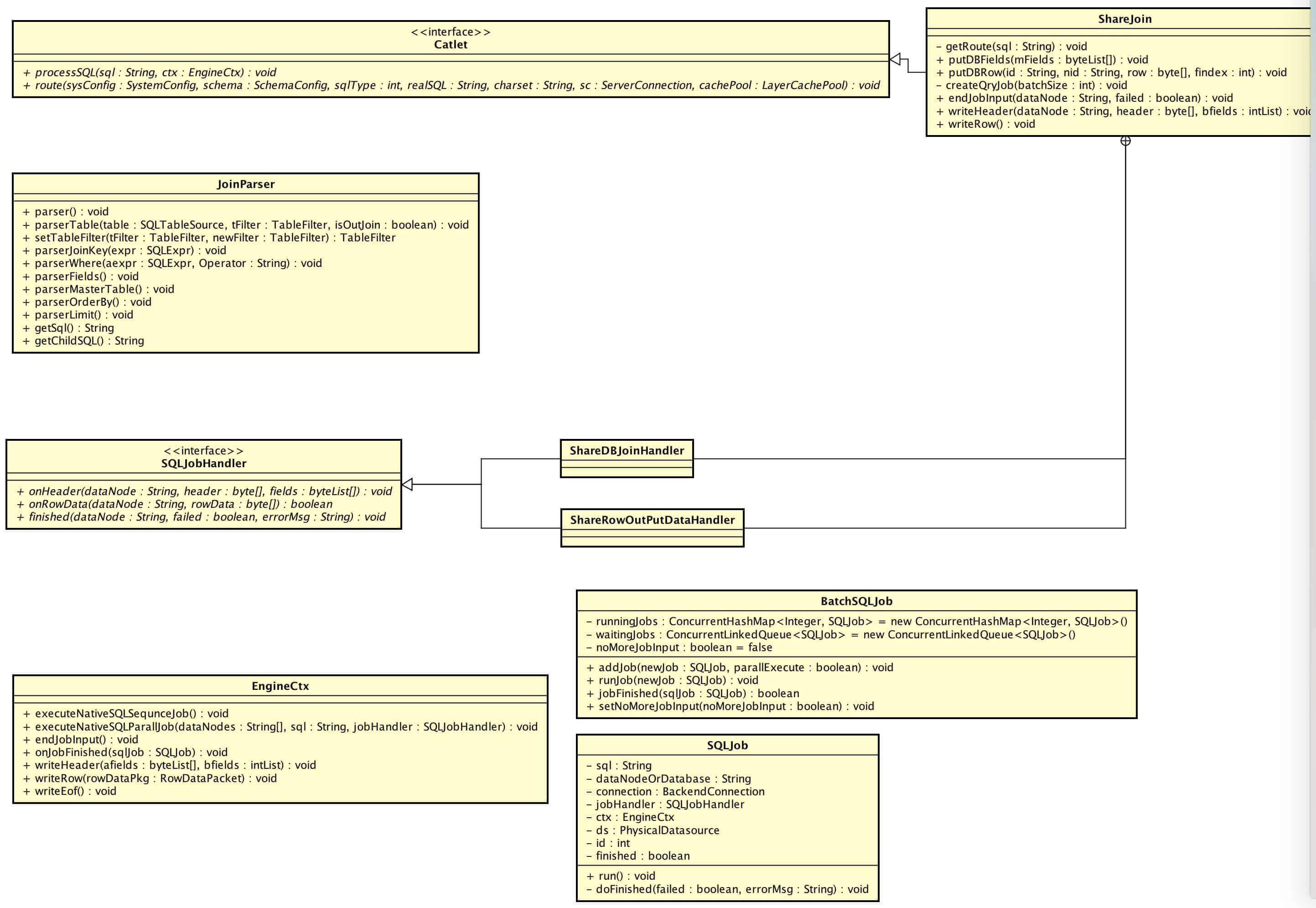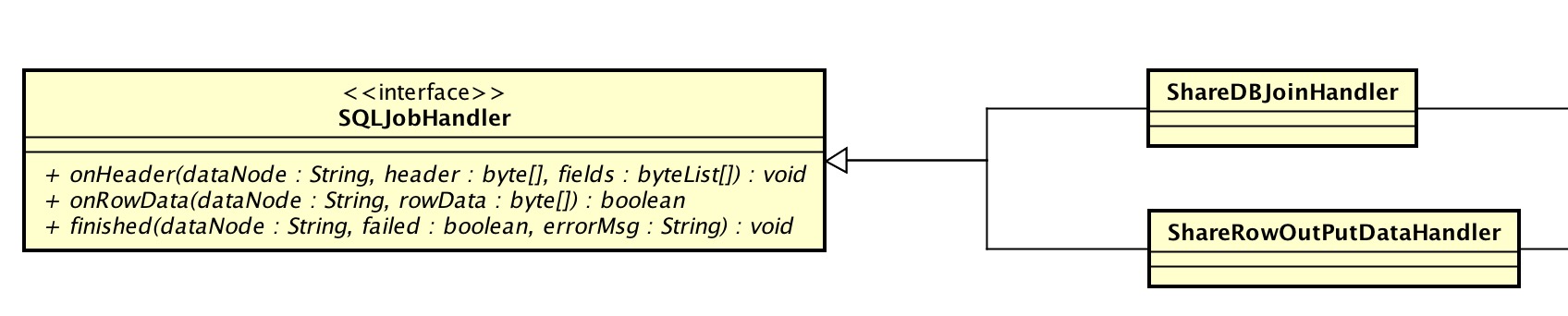 在 ShareJoin 里,SQLJobHandler 有两个实现:ShareDBJoinHandler、ShareRowOutPutDataHandler。前者,左边的表执行的 SQL 回调;后者,右边的表执行的 SQL 回调。
