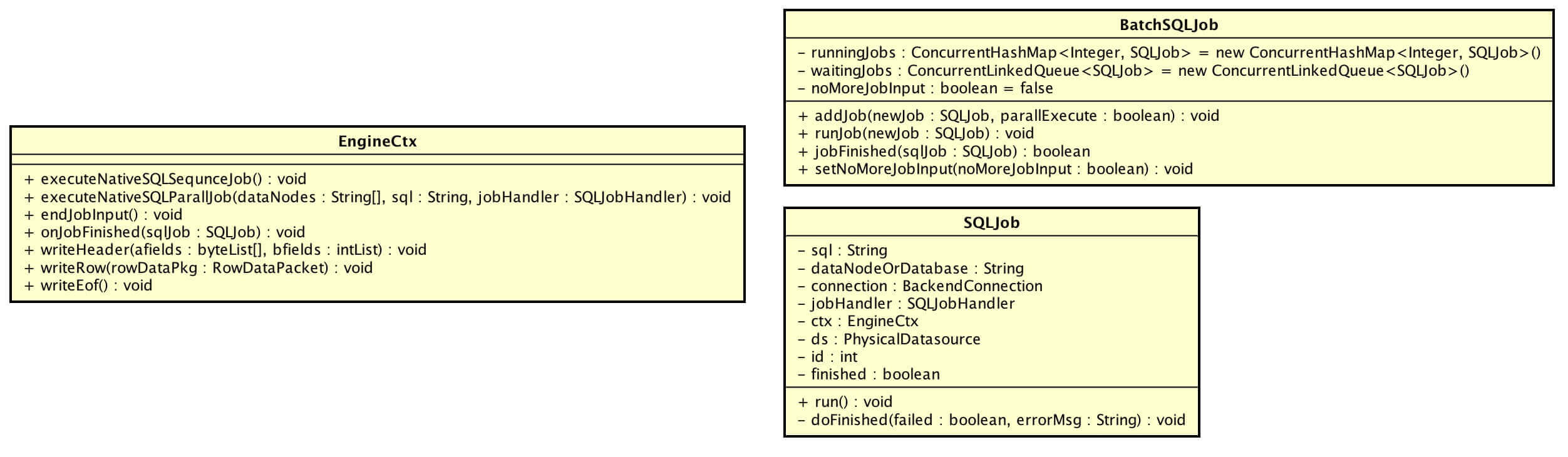 runningJobs存在执行中的任务时,#addJob(...)时,不立即执行,添加到waitingJobs。当SQLJob完成时,顺序调用下一个任务。 - 并发执行时,