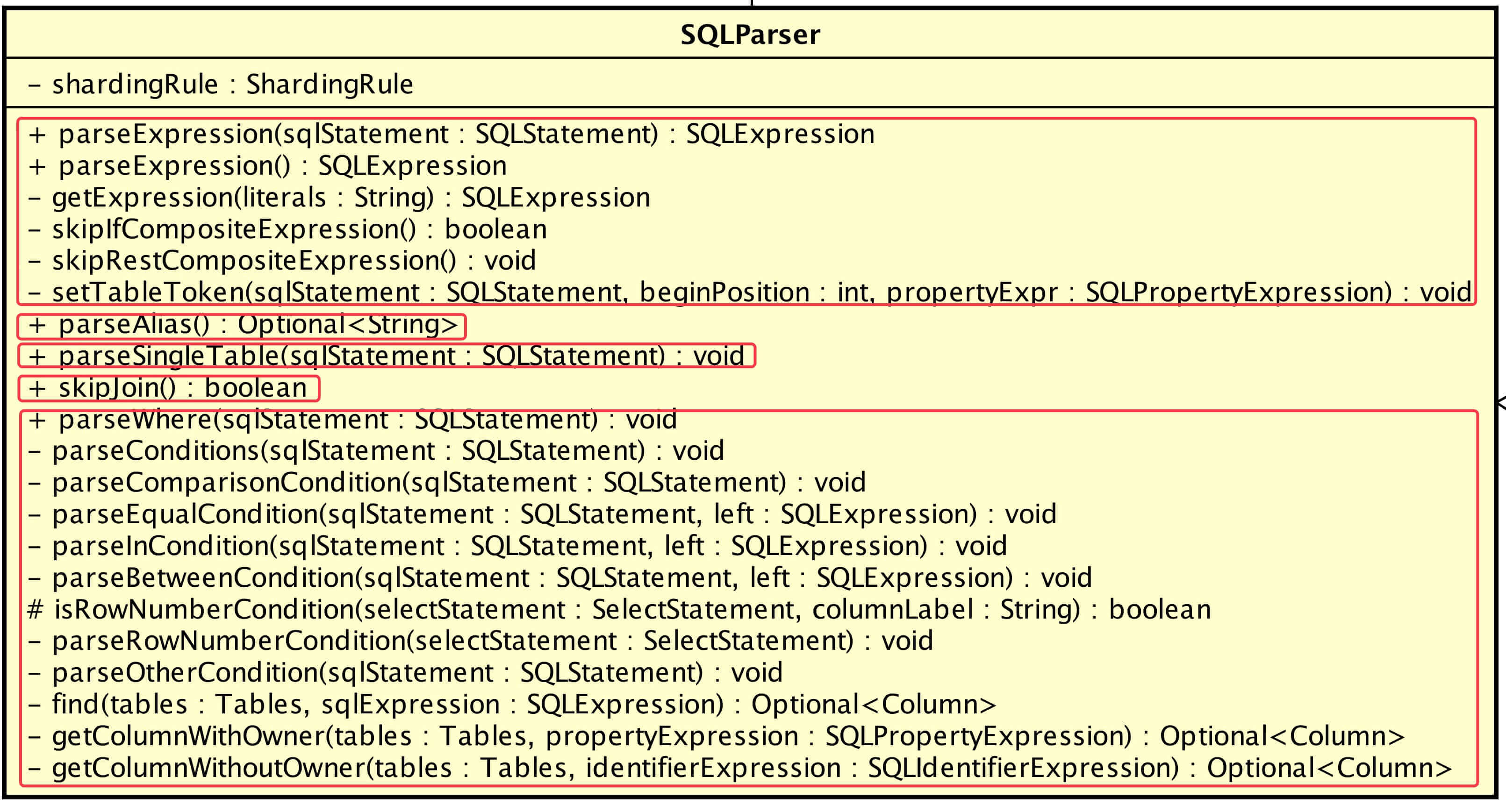 SQLParser,SQL 解析器,主要提供只考虑 SQL 块的解析方法,不考虑 SQL 上下文。下文即将提到的 StatementParser 将 SQL 拆成对应的块,调用 SQLParser 进行解析。�� 这么说,可能会有些抽象,我们下面来一起看。