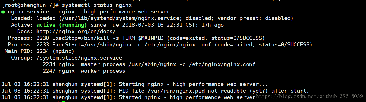 另外说一下,我这里选择yum除了安装方便外,还有一个很重要的因素,那就是yum安装可以自动将Nginx加入系统服务,不用再傻傻地到安装目录下适用./nginx或者一大串路径启动了,直接用systemctl(CentOS 6使用service)的start,stop,restart就可以完成启动,停止,重载,甚至可以用systemctl status nginx就可以直接看到nginx启动状态,非常方便: