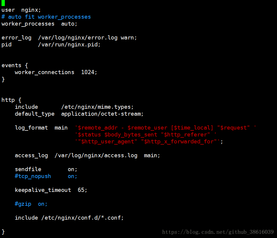 新文件的worker_processes的值是1,这里最好改成auto,这样nginx可以根据需要自动匹配工作进程数,其他的就不用动了,关于虚拟主机的配置在最后一行有,意思就是每次启动nginx的时候自动载入/etc/nginx/conf.d/下的全部.conf文件,至于这些.conf文件是什么,等下就知道了.