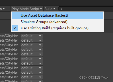 4. play Mode Script有三个选项,第一个是快速加载(faster),可以在Unity编辑器中测试,第二个是模拟加载(advanced),Unity模拟了一个远程加载的过程,第三个Build加载(requires),程序打包的时候,先要选择他,对资源进行打包