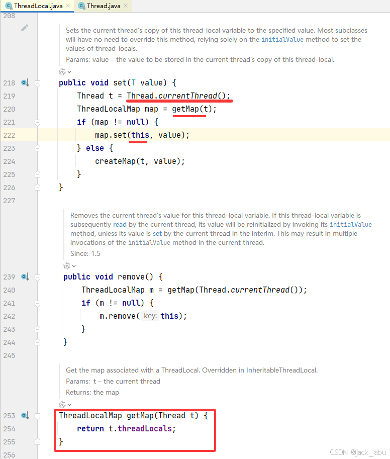 每个Thread实例内部维护一个ThreadLocalMap对象(名为threadLocals),用于存储该线程的本地变量副本。这是线程隔离的核心载体,每个线程的ThreadLocalMap完全独立,避免多线程竞争。public class Thread implements Runnable { ... /* ThreadLocal values pertaining to this thread. This map is maintained * by the ThreadLocal class. */ ThreadLocal.ThreadLocalMap threadLocals = null; /* * InheritableThreadLocal values pertaining to this thread. This map is * maintained by the InheritableThreadLocal class. */ ThreadLocal.ThreadLocalMap inheritableThreadLocals = null; ... } -