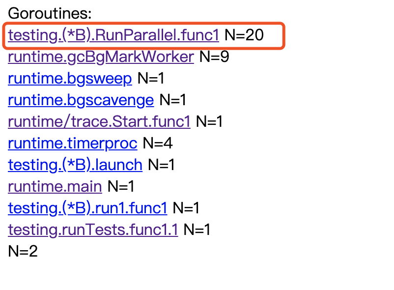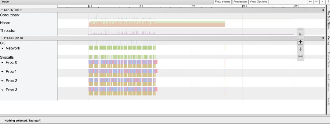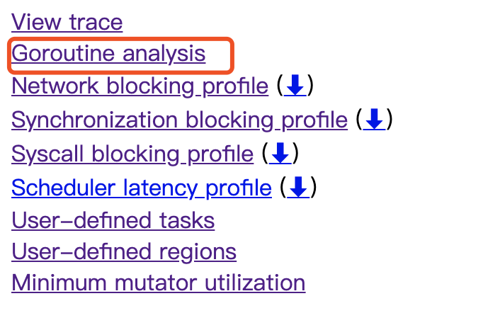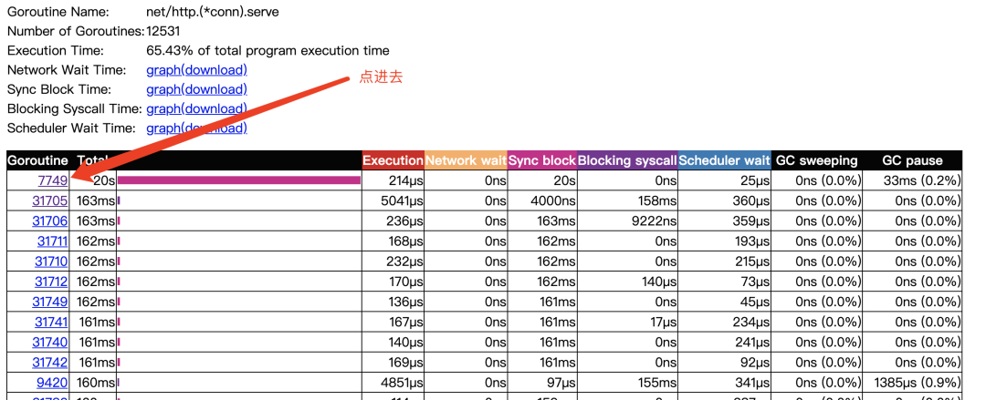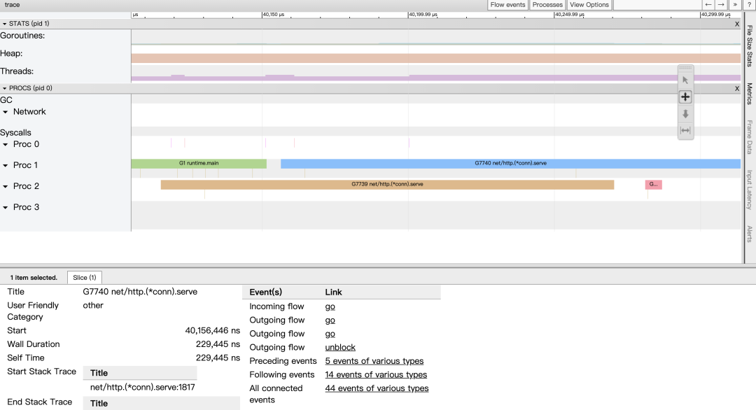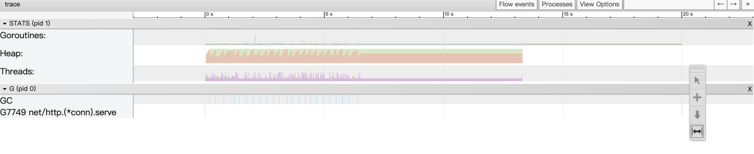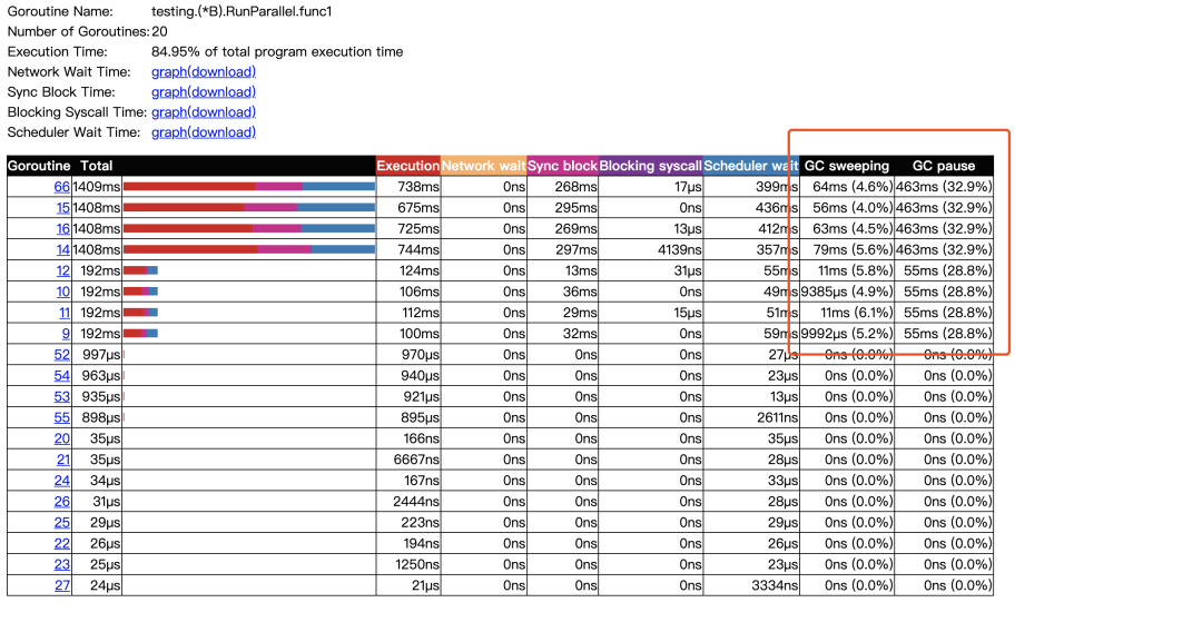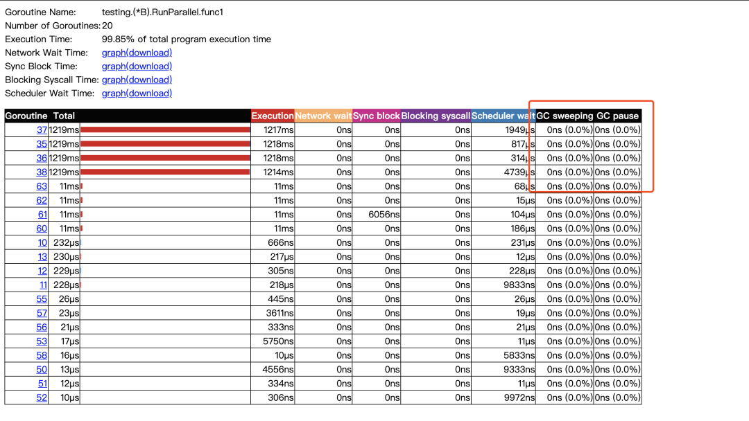 作用:清晰查看每个逻辑处理器中Goroutine的执行过程,可以很直观看出Goroutine的阻塞消耗,包含网络阻塞、同步阻塞(锁)、系统调用阻塞、调度等待、GC执行耗时、GC STW(Stop The World)耗时。