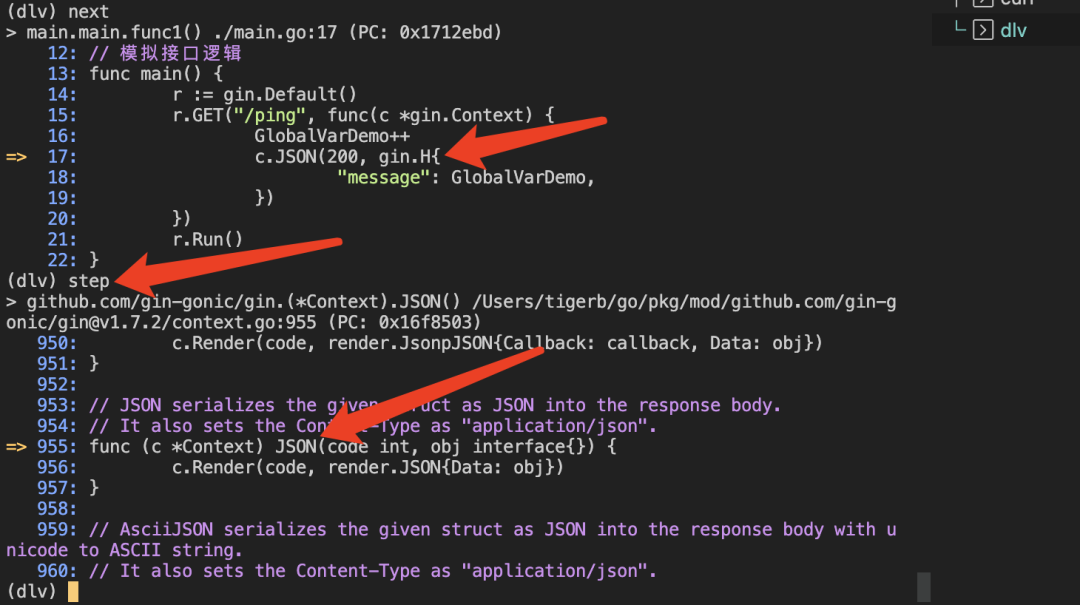 dlv attach 36968进入调试模式,调试代码(和上面一样)