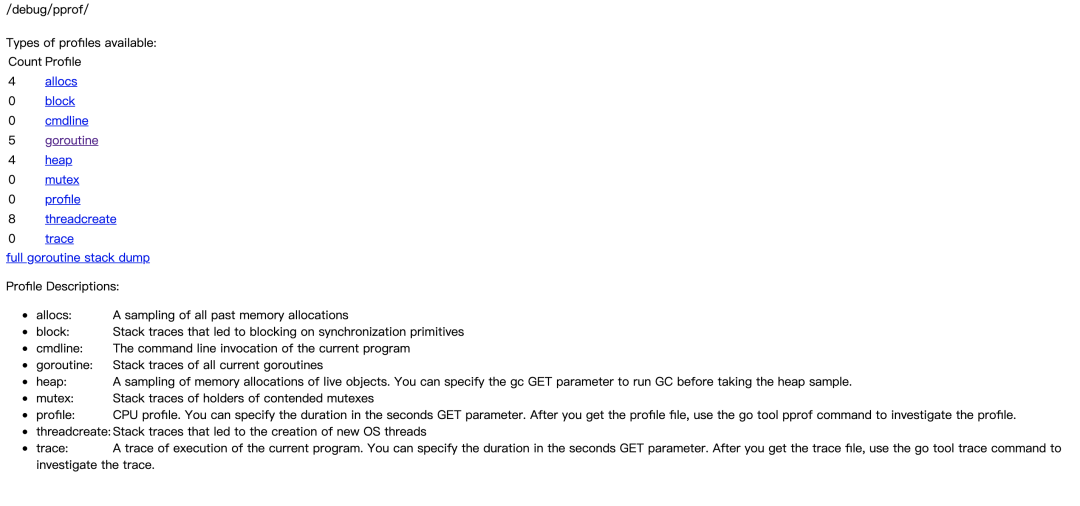 2. 访问链接 http://localhost:8888/debug/pprof/,可以看见相关profiles。