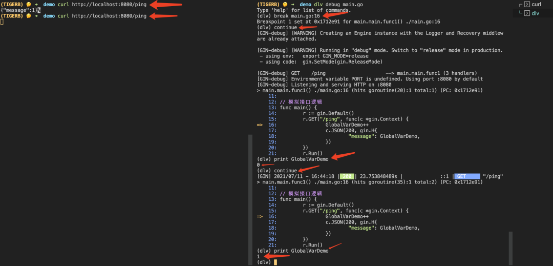 break main.go:16给行GlobalVarDemo++打断点(continue或c:继续执行):continue