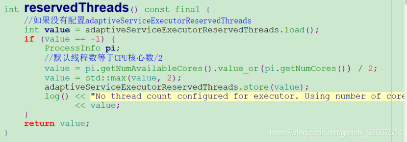 从步骤6中可以看出,control控制线程创建工作线程的第一个条件为:如果该线程超过stuckThreadTimeout阀值都没有做线程压力控制检查,并且线程池中线程数全部在处理任务队列中的任务,这种情况control线程一次性会创建reservedThreads个线程。reservedThreads由adaptiveServiceExecutorReservedThreads配置,如果没有配置,则采用初始值CPU/2。