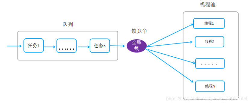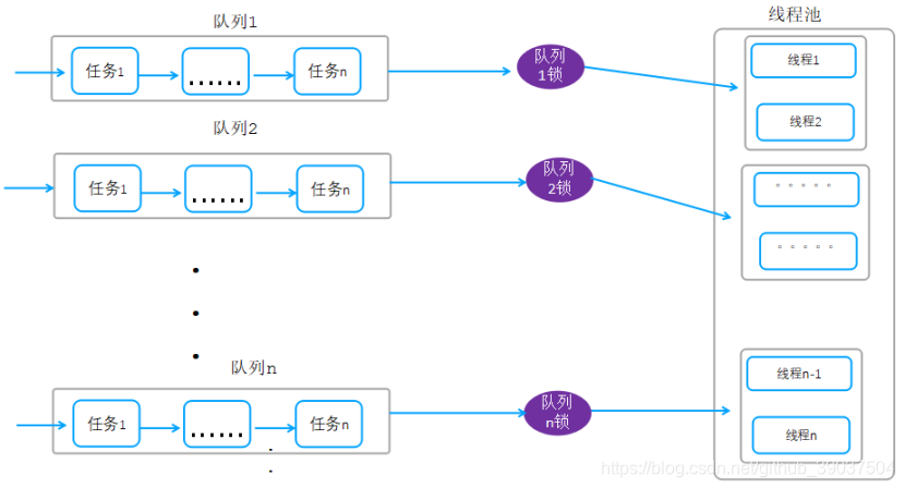 优化思路:我们可以通过优化队列和锁来提升整体性能,当前的队列只有一个,我们可以把单个队列调整为多个队列,每个队列一把锁,任务入队的时候散列到多个队列,通过该优化,锁竞争及排队将会得到极大的改善。