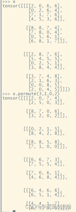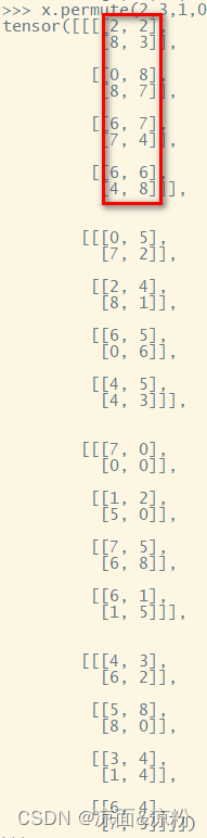 从结果形状向前看是2,表示有2个2x4的矩阵,前面有一个[[2,0,7,4],[2,5,0,3]]的2x4矩阵了,另一个去哪取?看对应的permute参数是1,表示去原张量的第1维度去取。已经有一个2x4的矩阵是在第一个第1维的4x4的子元素里取了一个[2,0,7,4],那就在第一个第1维元素里取另外一个4x4的子元素里取