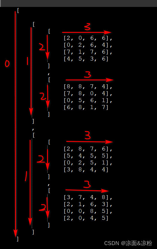 0维下有2个2x4x4的元素,每个元素下有2个4x4的矩阵,形成了(2,2,4,4)的张量。