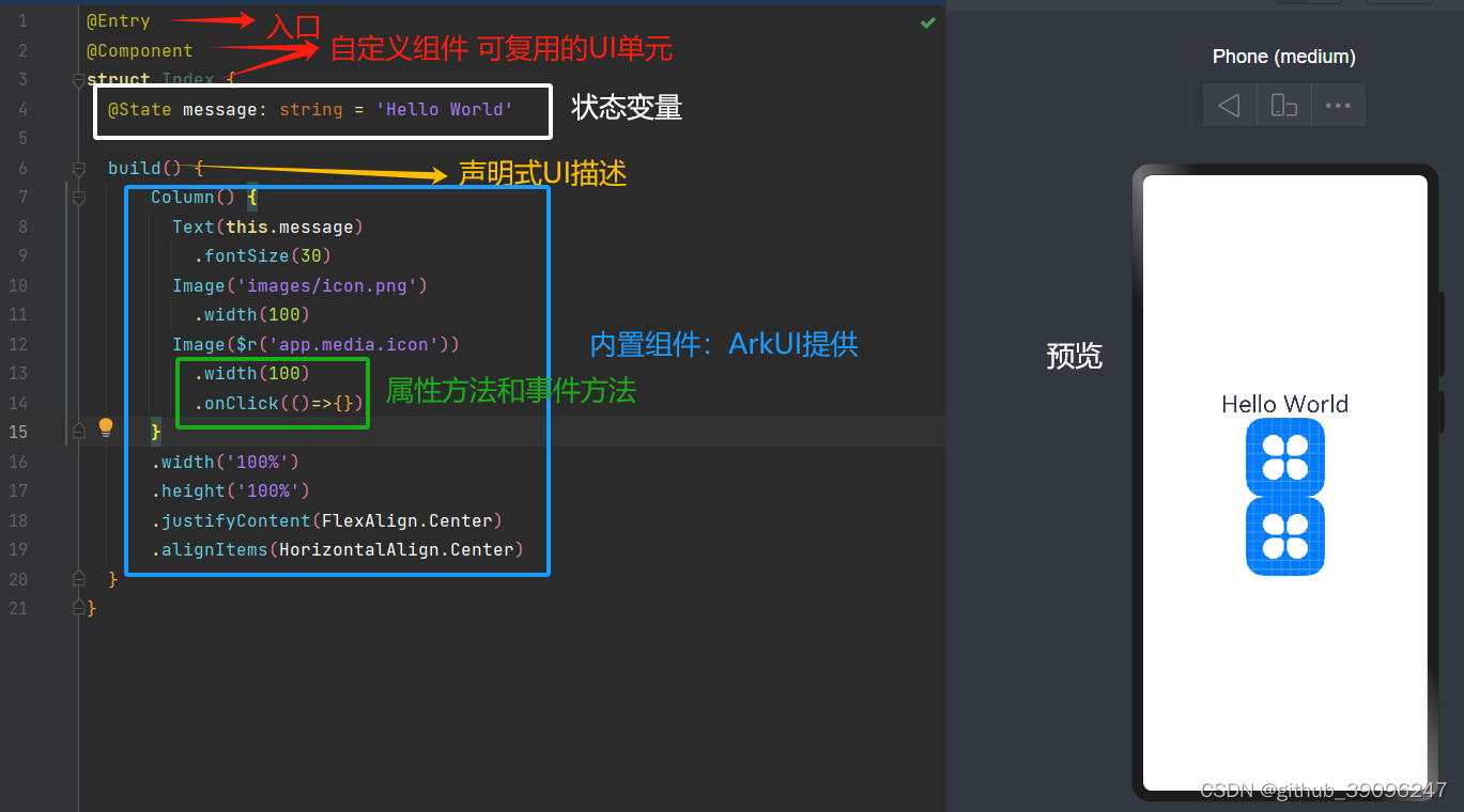 - 装饰器: 用于装饰类、结构、方法以及变量,并赋予其特殊的含义。如上述示例中@Entry、@Component和@State都是装饰器,@Component表示自定义组件,@Entry表示该自定义组件为入口组件,@State表示组件中的状态变量,状态变量变化会触发UI刷新。