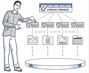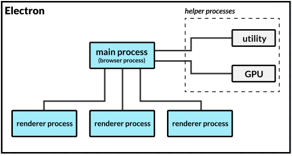 作为应用开发者,你将控制两种类型的进程:主进程 和 渲染器进程。 这类似于上图所述的 Chrome 的浏览器和渲染器进程。