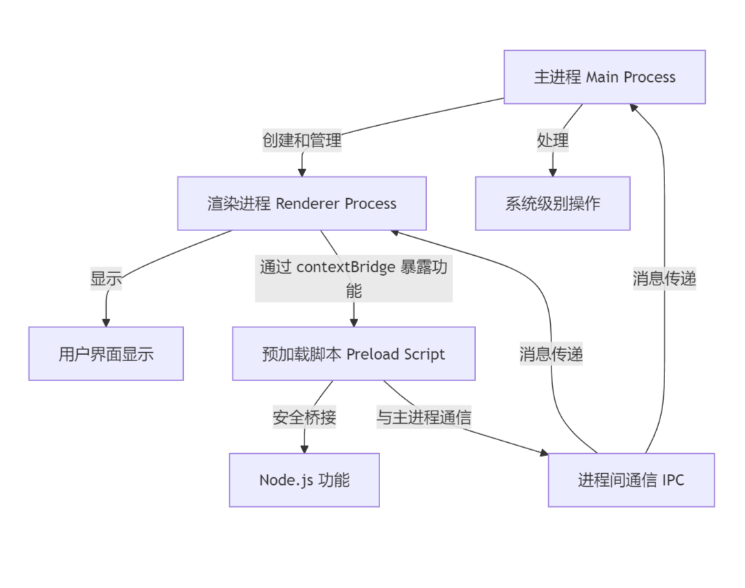 总体来说Electron 采用多进程架构,包括一个主进程和多个渲染进程。主进程负责管理应用生命周期和系统级别操作,运行在 Node.js 环境中,具有完整的系统访问权限。渲染进程负责显示用户界面,每个窗口对应一个独立的渲染进程,运行在浏览器环境中,默认启用上下文隔离以增强安全性。通过预加载脚本,渲染进程可以安全地访问部分 Node.js 功能,并通过 ipcRenderer 与主进程通信,实现复杂功能的扩展和数据的安全传递。这种架构保证了应用的高性能、高安全性和高稳定性。