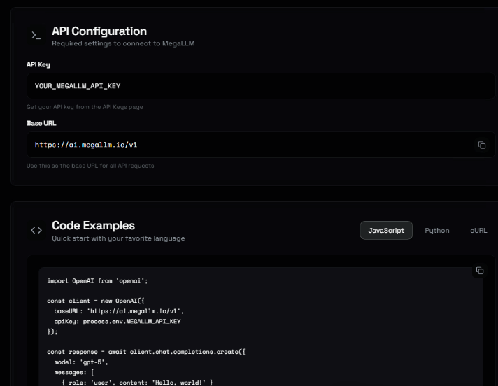MegaLLM完全兼容OpenAI和Anthropic的API格式,如果你的代码之前用的OpenAI,直接改个URL和密钥就能用,特别简单。