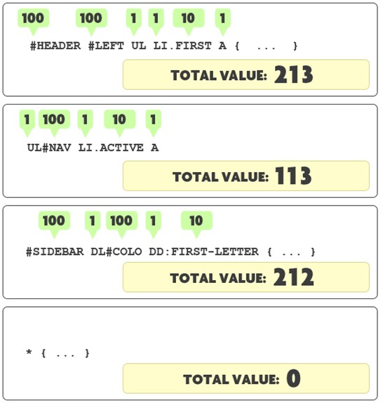 我们把特殊性分为4个等级,每个等级代表一类选择器,每个等级的值为其所代表的选择器的个数乘以这一等级的权值,最后把所有等级的值相加得出选择器的特殊值。
